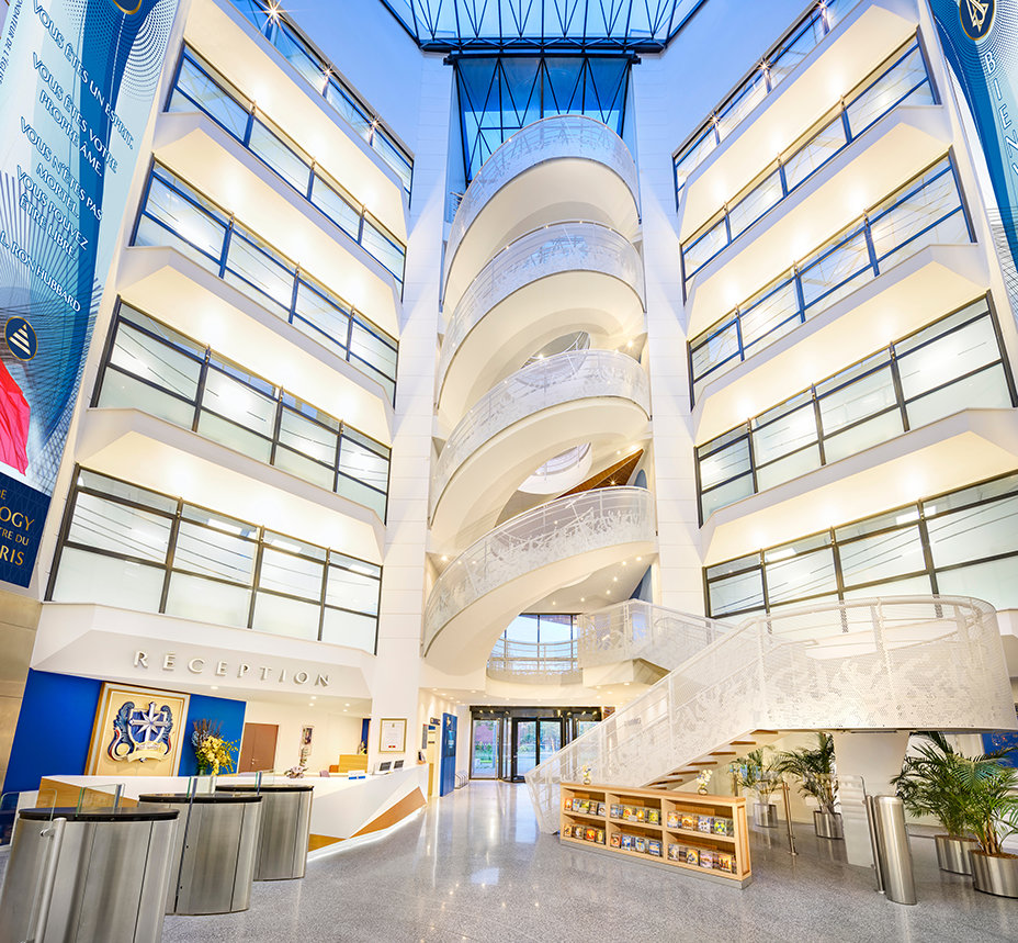 Among the facility’s striking architectural features are its gleaming glass exterior, comprising more than 1,500 reflective panes, and a modern geometric wood portal—all to welcome Parisians to the extraordinary adventure of true spiritual liberté.
